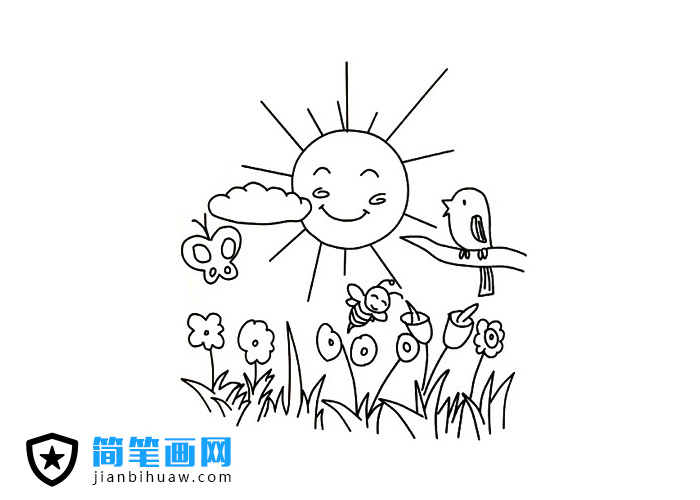 太陽、小鳥、蜜蜂上演風(fēng)和日麗鳥語花香的簡筆畫圖片
